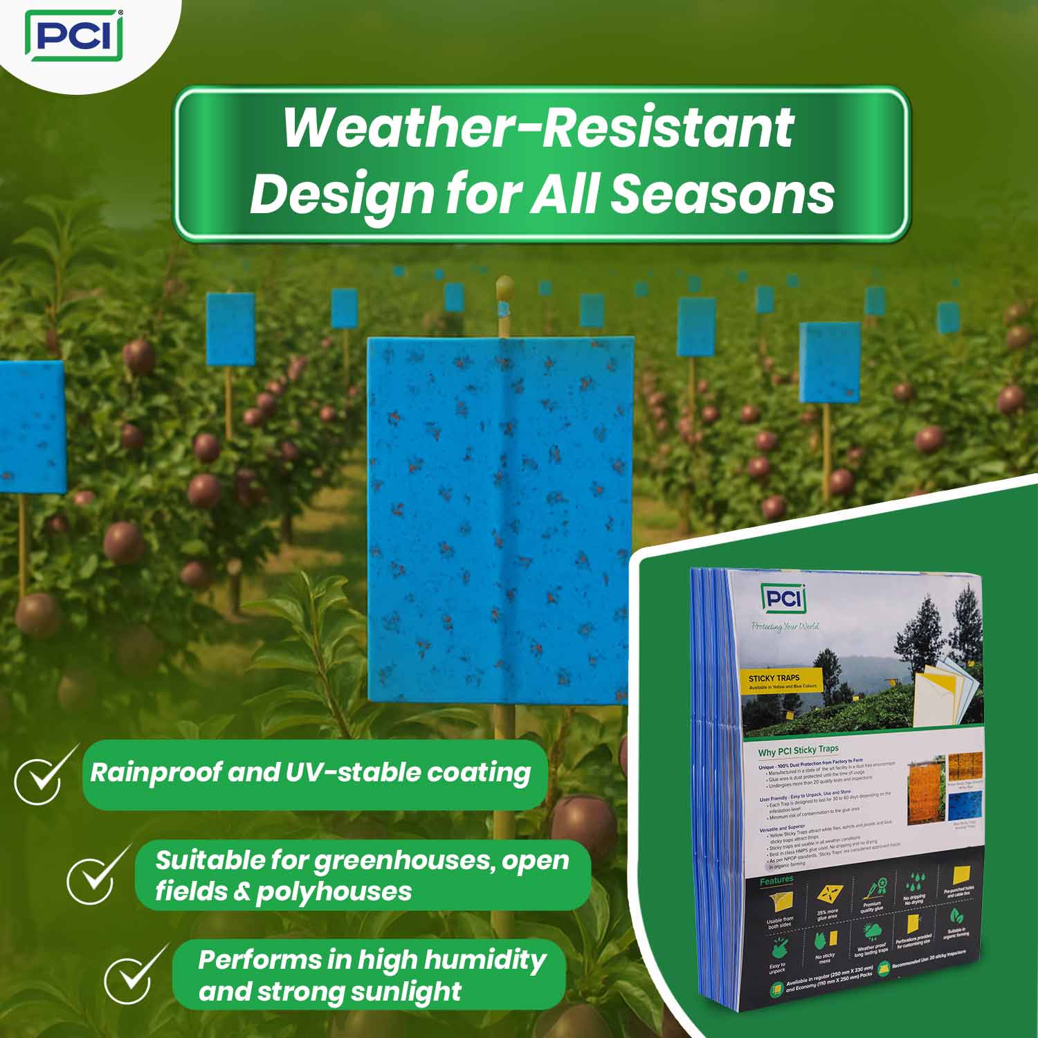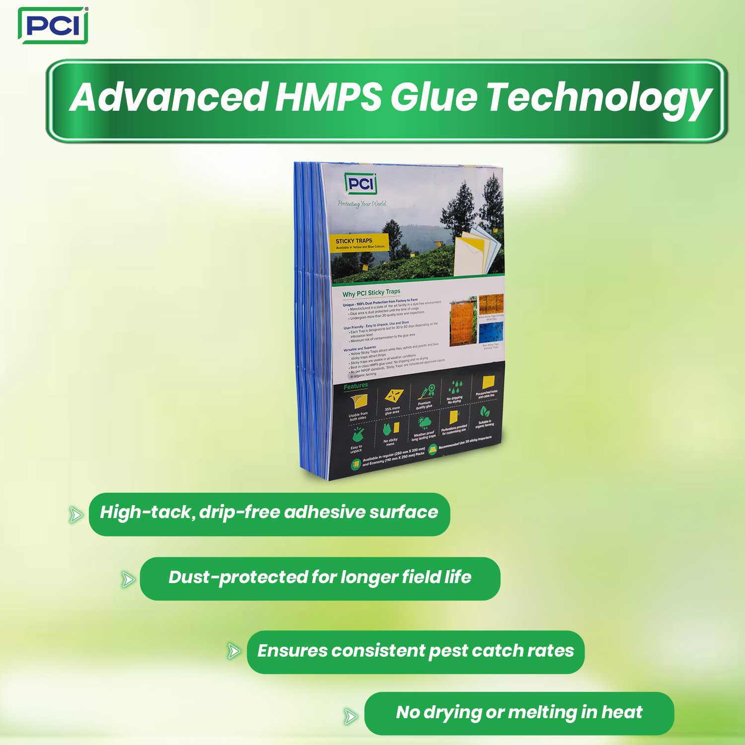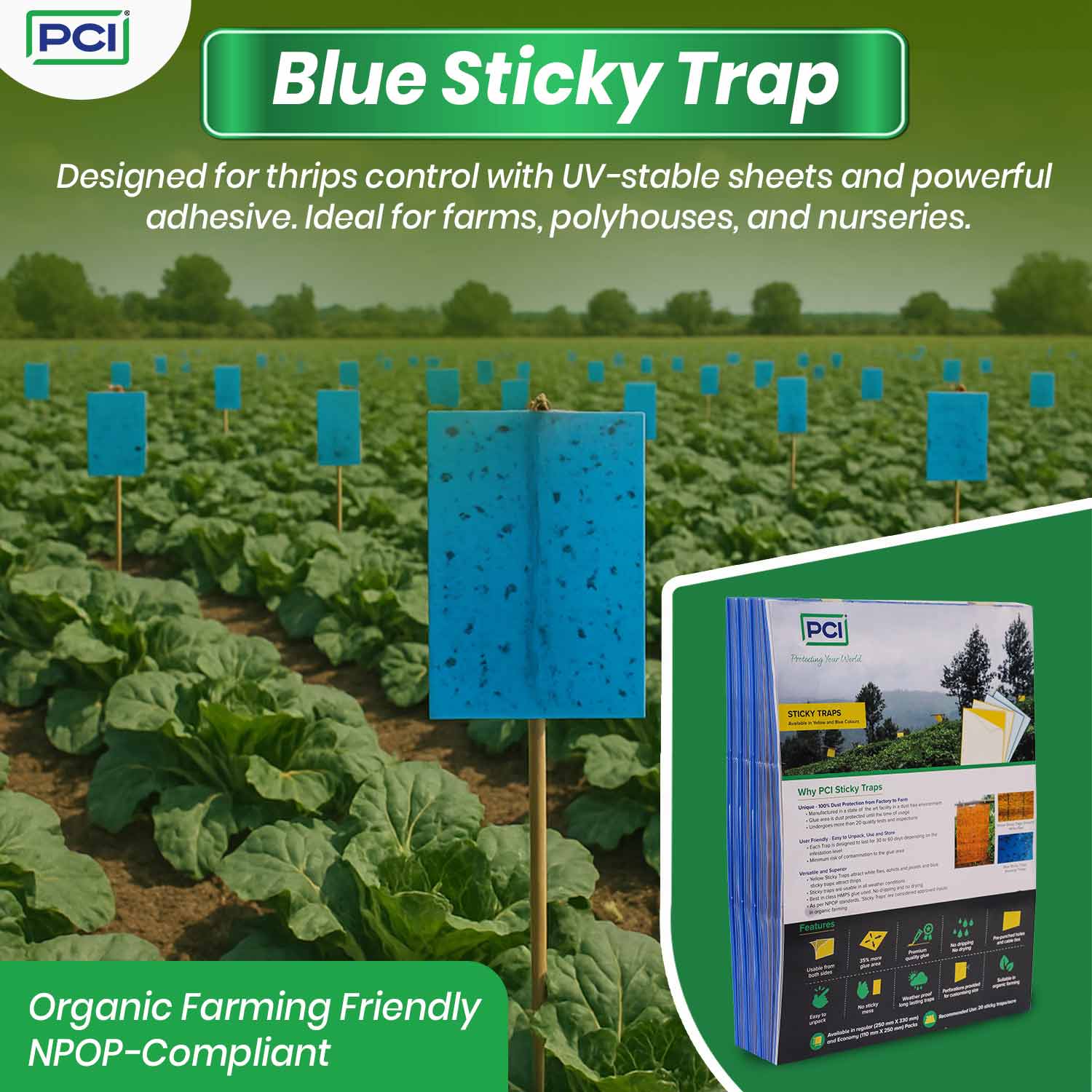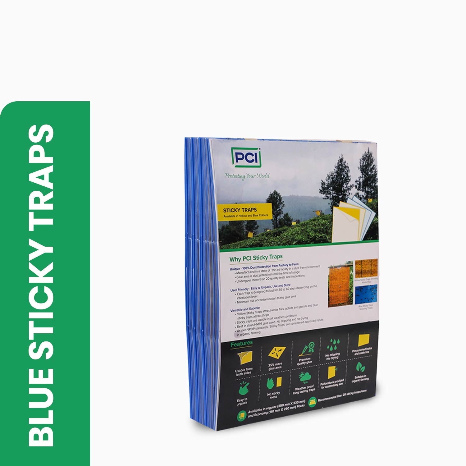 Blue Sticky Traps are specially designed to attract thrips, making them ideal for use in greenhouses, ornamental crops, and farms. Made with dust-protected HMPS glue, these traps ensure clean, effective, and long-lasting performance. The strong adhesive is drip-free, UV-resistant, and works in all weather conditions. Safe for organic farming and NPOP compliant, they offer reliable pest control without harming beneficial insects. Each sheet is easy to peel and comes with pre-punched holes and ties for quick setup. Suitable for mass trapping and monitoring, these traps help maintain a healthy crop environment.