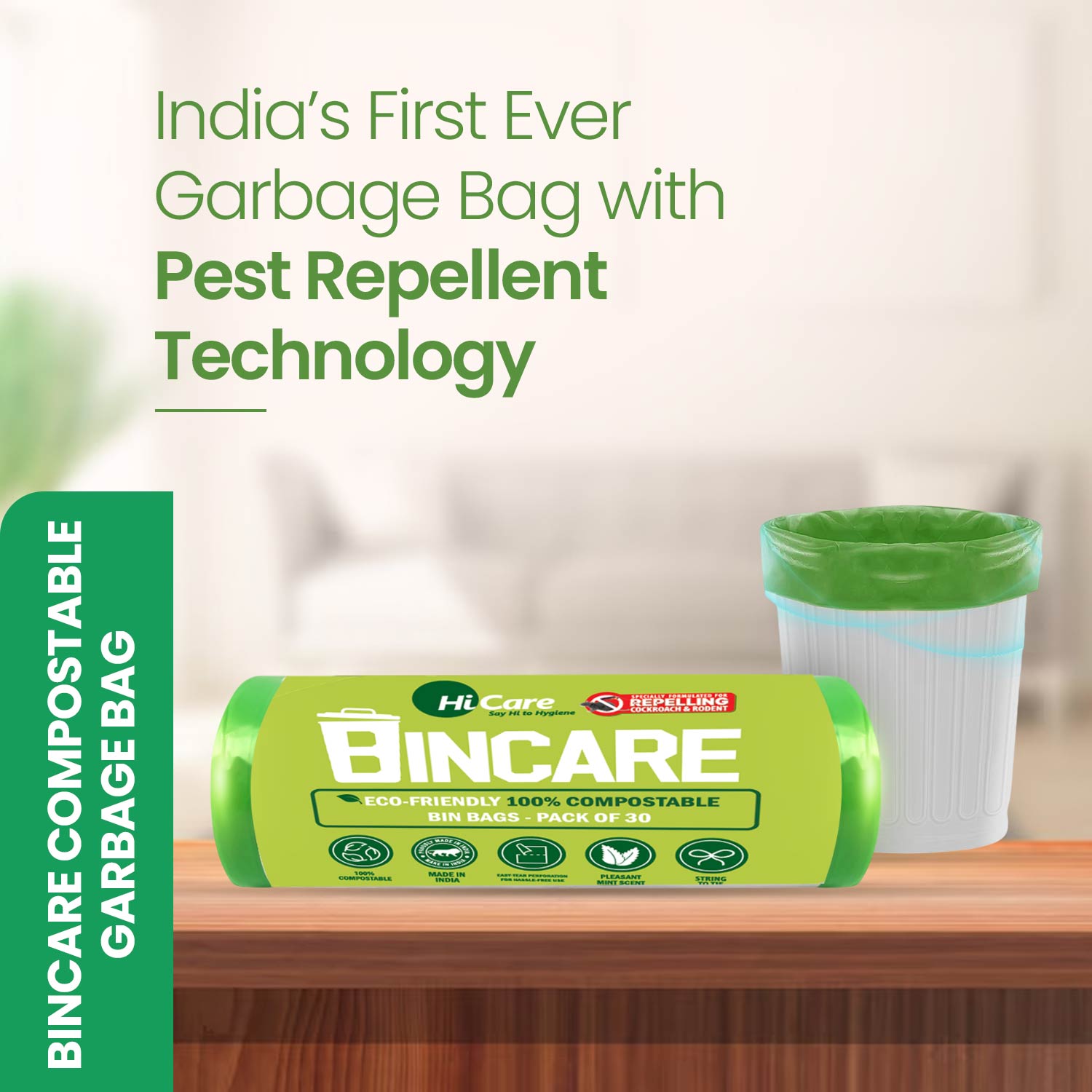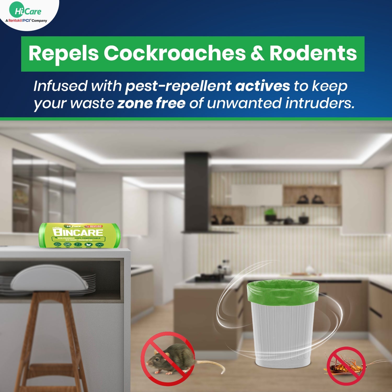 HiCare Bincare brings you India’s first pest-repellent Compostable garbage bags designed to keep cockroaches and rodents away from your waste. Ideal for use in kitchens, bathrooms, offices, and more, these bags help maintain hygiene and reduce the risk of disease. Made from strong, tear-resistant Compostable material, they can handle both wet and dry waste efficiently. The leak-proof bottom prevents spills, while a refreshing mint scent helps control foul odours. Each bag comes with a detachable string tie for clean and easy disposal. Sized at 19 x 21 inches, they fit most standard dustbins. Each pack contains 4 rolls with 30 bags per roll. Eco-friendly, hygienic, and smart—Bincare is the better way to manage waste.
