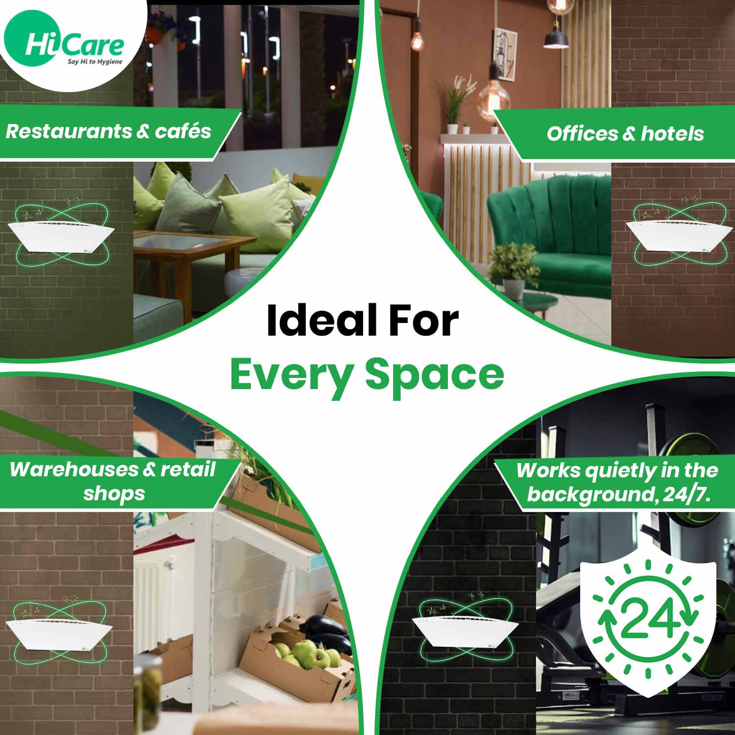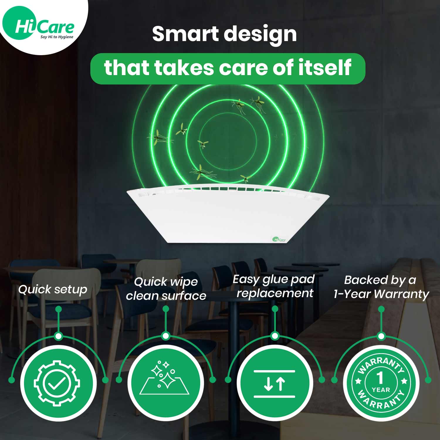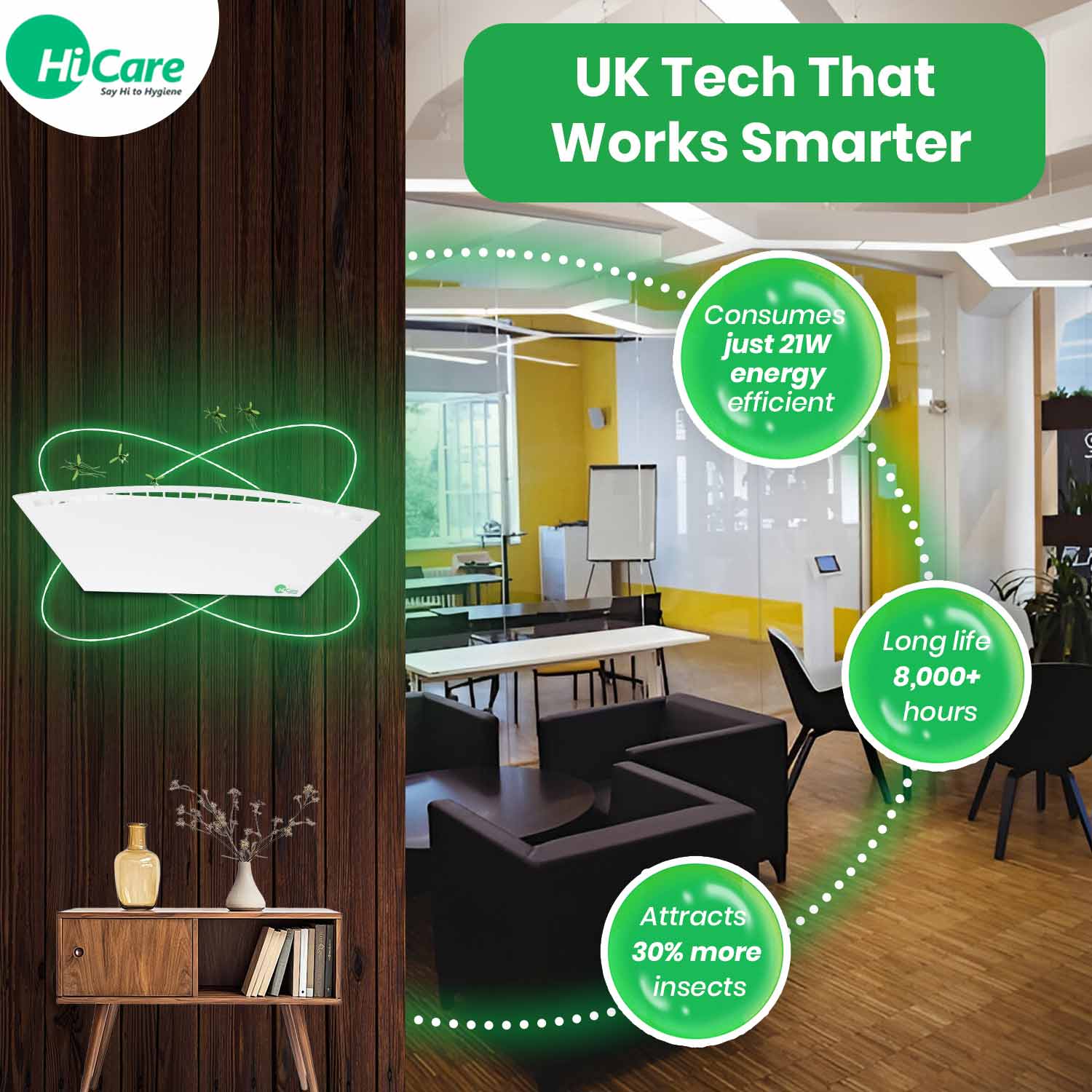 HiCare Lite is a silent and energy-efficient fly catcher designed for modern indoor spaces. Powered by a UK-made UV green lamp, it effectively attracts and traps flying insects without using chemicals. With 400 sq. ft. of coverage, it’s ideal for homes, restaurants, cafes, hotels, and warehouses. Its compact design fits seamlessly into any setting, and the low power usage ensures cost-effective daily operation. A safe, mess-free solution for maintaining hygiene and comfort.