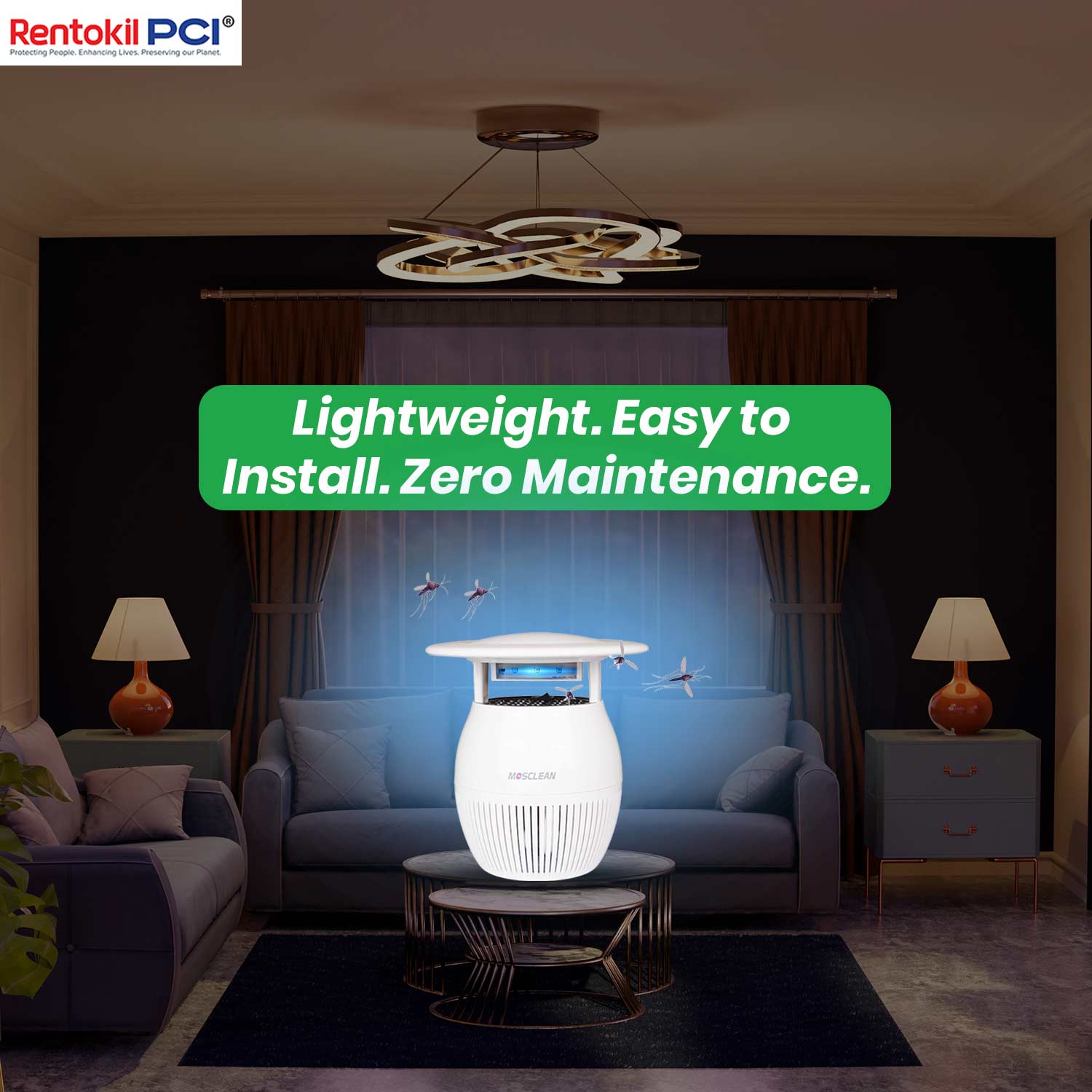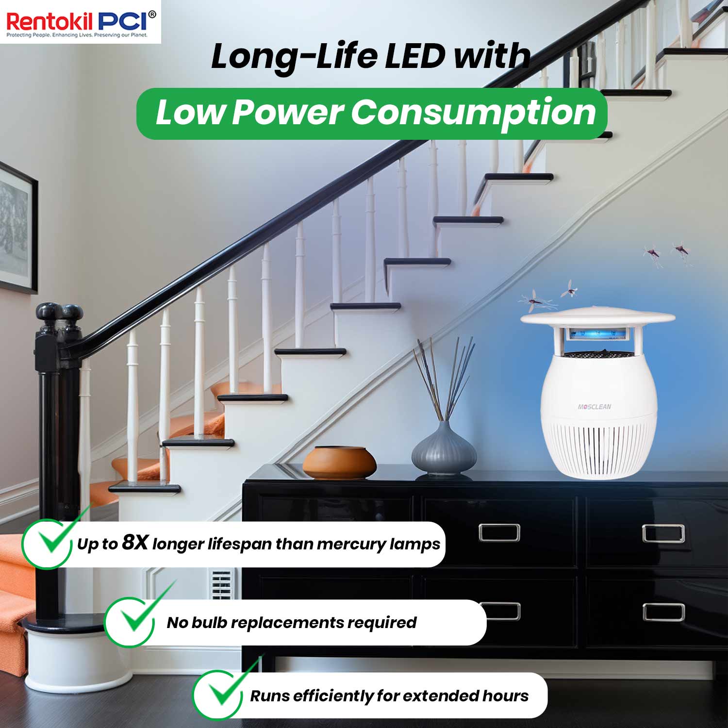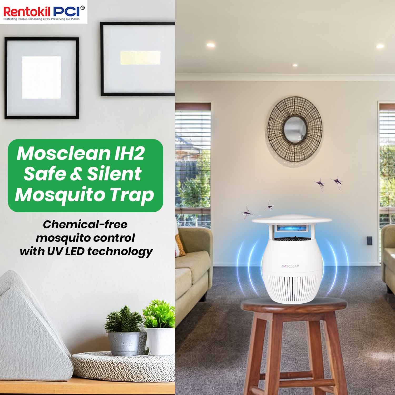 Mosclean IH2 is an eco-friendly, high-performance mosquito trap designed for indoor use. It uses UV LED technology to attract and trap mosquitoes without the use of chemicals, gases, or refills. This advanced system is proven to capture up to 5X more Aedes aegypti and 9X more general mosquitoes compared to traditional traps. With silent operation, no insect debris, and no ozone discharge, it offers a clean and safe solution for homes, offices, and enclosed areas. The durable LED light lasts up to 8 times longer than mercury lamps and consumes minimal power, making Mosclean IH2 a cost-effective and low-maintenance option for long-term mosquito control.