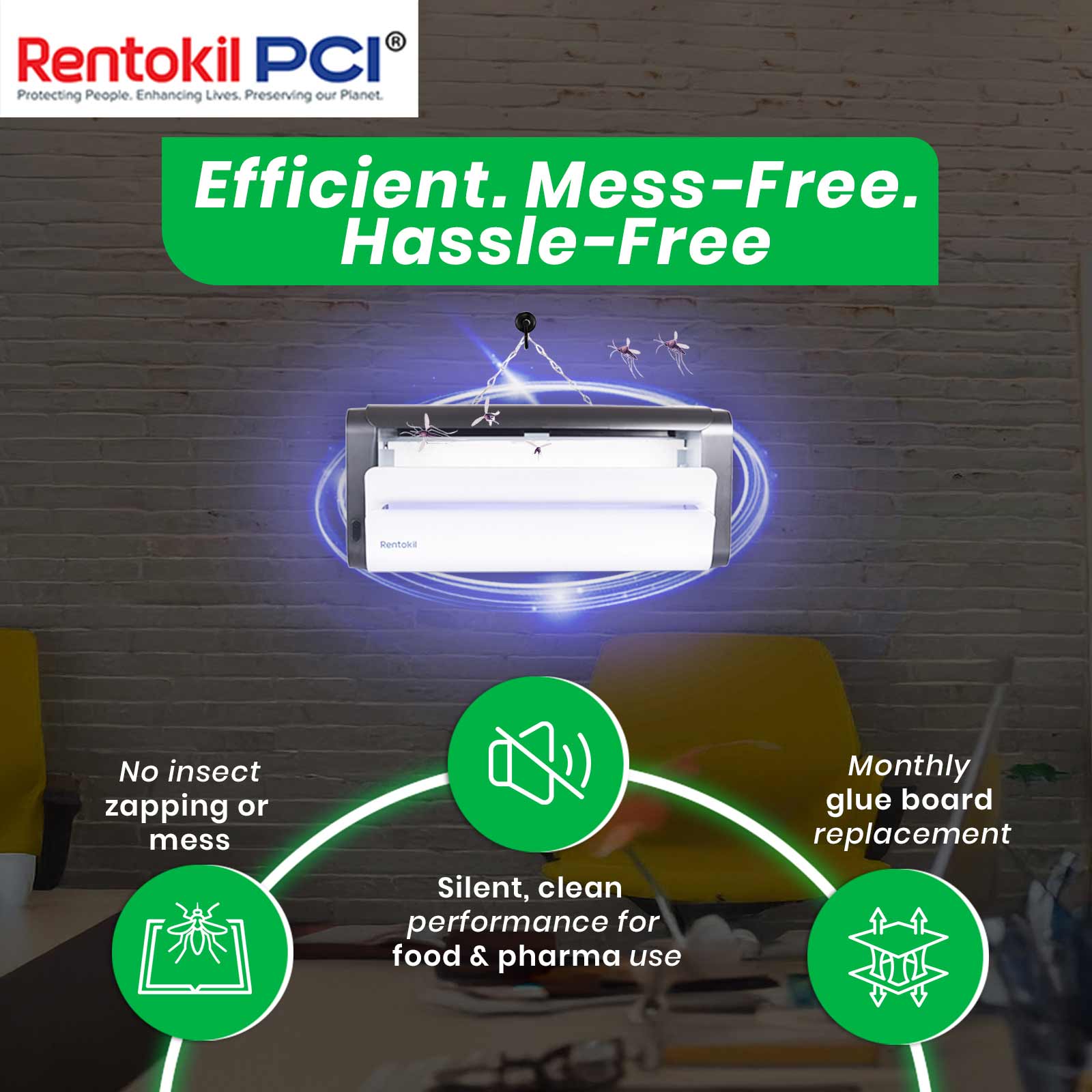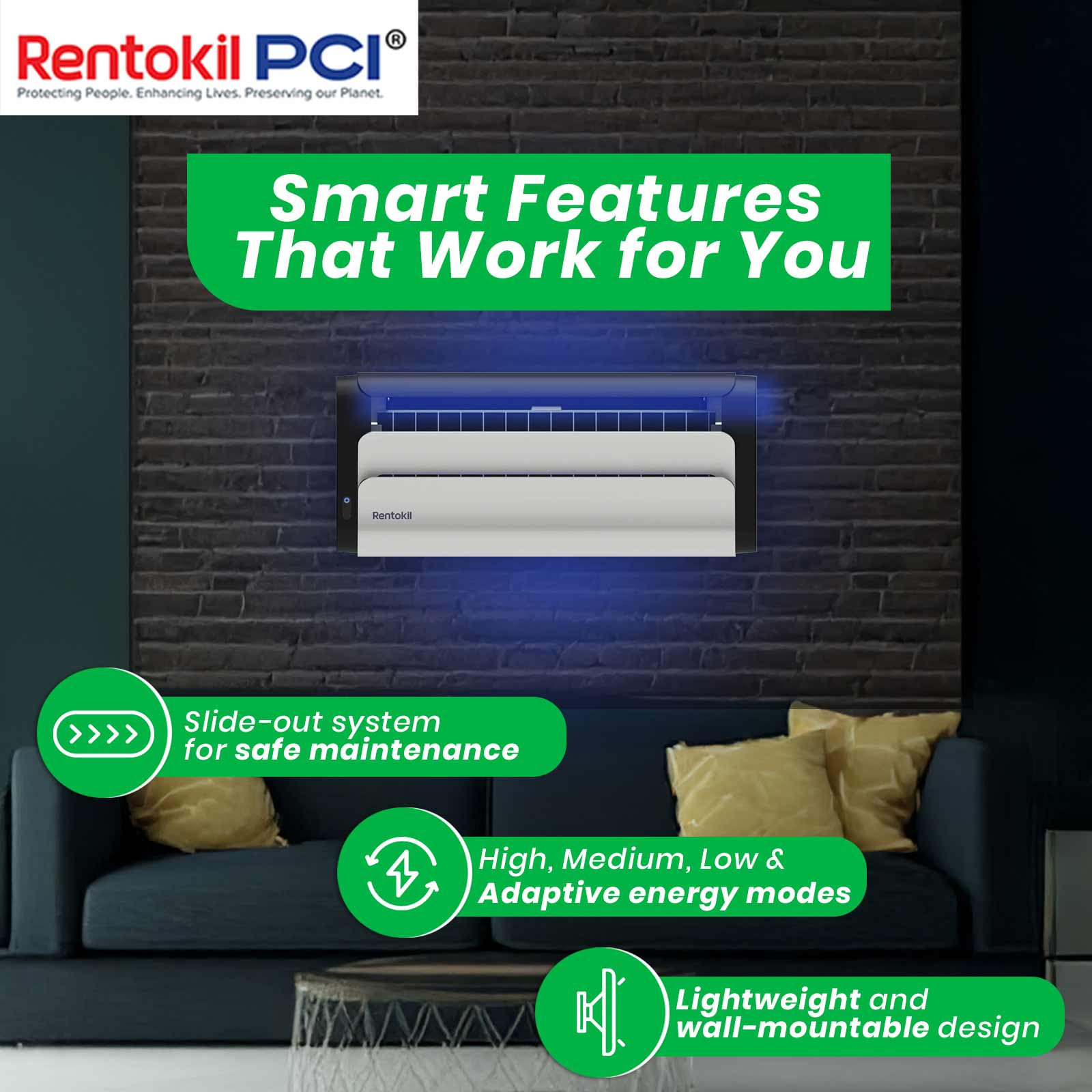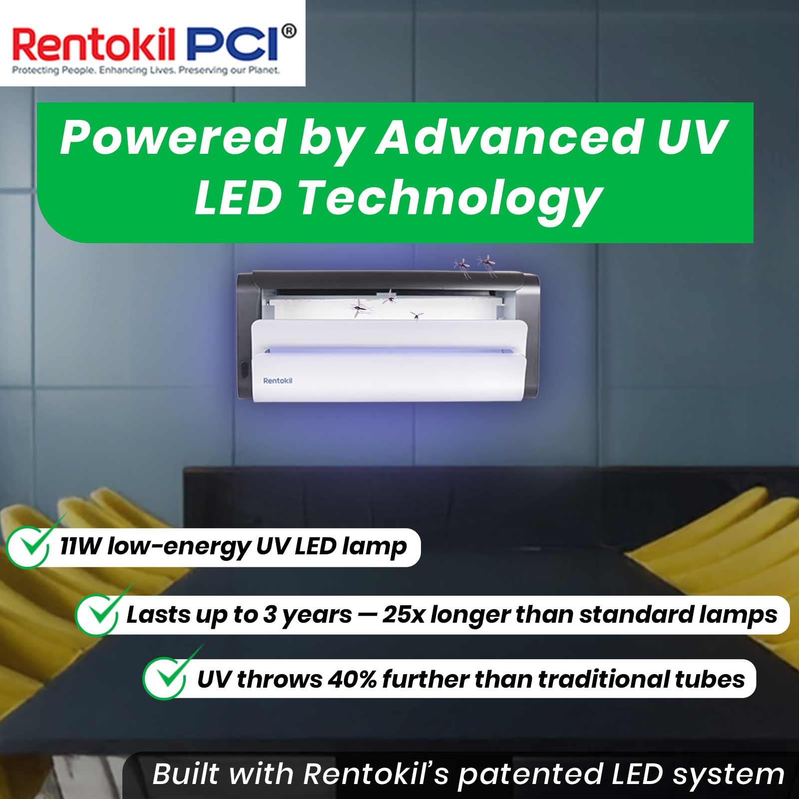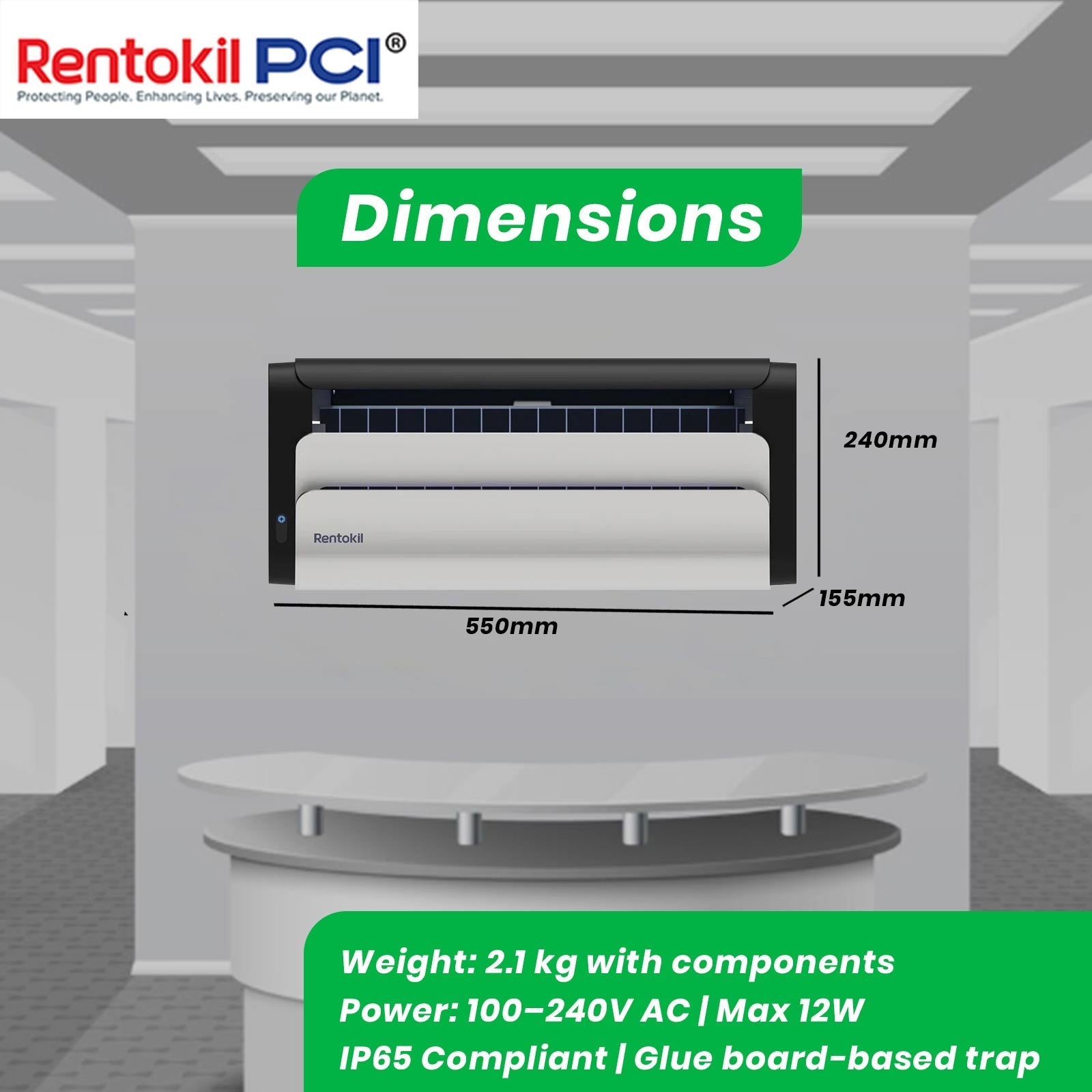 Rentokil Lumnia Compact is a powerful yet sleek LED fly control unit, designed for front-facing commercial spaces like hotels, cafés, clinics, and retail outlets. Featuring an 11W UV LED lamp that lasts up to 3 years and projects light 40% further than traditional tubes, it ensures effective insect control while saving up to 61% energy. The mess-free glue board system captures flies hygienically, making it ideal for sensitive environments. With adaptive energy modes and a unique sliding track for easy maintenance, this unit offers long-term performance with low upkeep. Developed by Rentokil, a global leader in pest control, Lumnia Compact delivers reliable protection with a modern, professional finish.